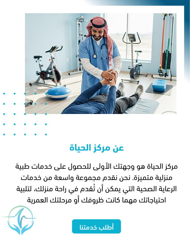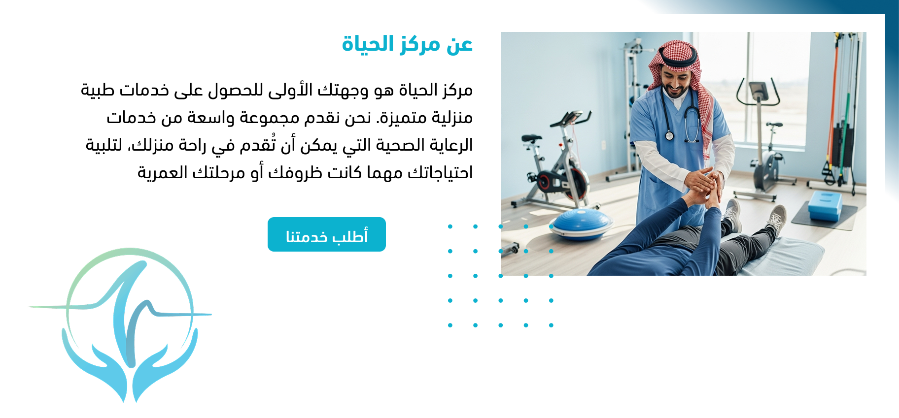 مركز الحياة هو وجهتك الأولى للحصول على خدمات طبية منزلية متميزة. نحن نقدم مجموعة واسعة من خدمات الرعاية الصحية التي يمكن أن تُقدم في راحة منزلك، لتلبية احتياجاتك مهما كانت ظروفك أو مرحلتك العمرية.
